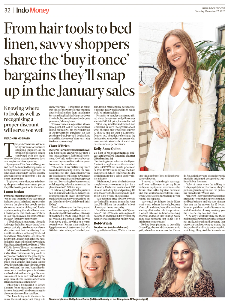 I was featured in the Irish Independent in print just after Christmas. The piece looked at January sales and long term value, and I shared how I think about spending decisions and linking everyday choices back to bigger financial goals, including pensions. https://www.independent.ie/business/money/from-hair-tools-to-bed-linen-savvy-shoppers-share-the-buy-it-once-bargains-theyll-be-snapping-up-in-the-january-sales/a127246585.html